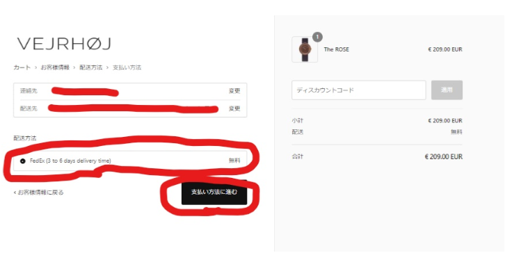 連絡先と配送先を記入しましたら、下のFedEx (3 to 6 days delivery time) にチェックを入れましょう。