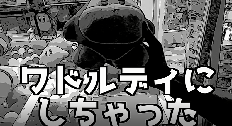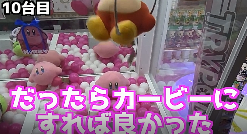 これは一つの動画で僕が普通に笑ってしまったやり取りの一部で確立機を全台プレイして何個景品が取れるのか検証している動画で、取れないもんだと思ってプレイしていたのでカービィではなくワドルディを掴んで取れてしまった動画です。